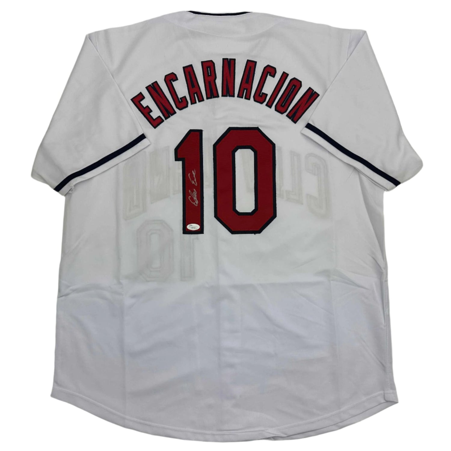 Camiseta de béisbol blanca de Cleveland autografiada/firmada por Edwin Encarnación JSA COA