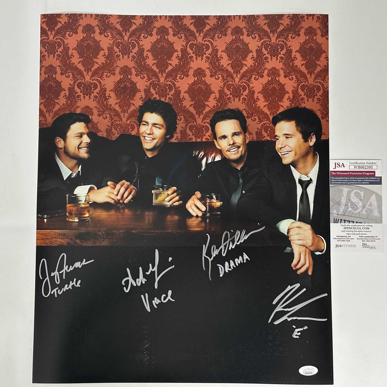 La foto está firmada por: Adrian Grenier (Vincent Chase), Kevin Connolly (Eric Murphy), Jerry Ferrara (Turtle) y Kevin Dillon (Johnny Drama Chase), y lleva inscritos los nombres de sus personajes. La pieza está enmarcada y paspartú profesionalmente, ¡lista para colgar en tu espacio íntimo! Se pueden solicitar placas de identificación y paspartú.