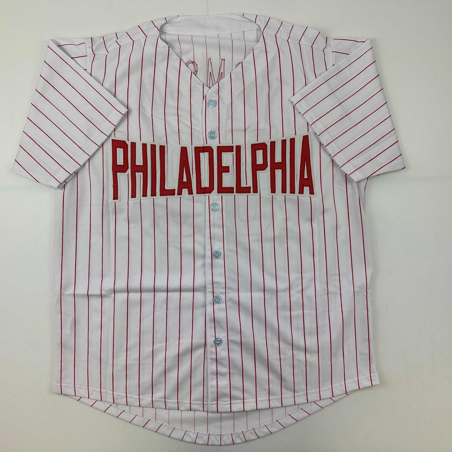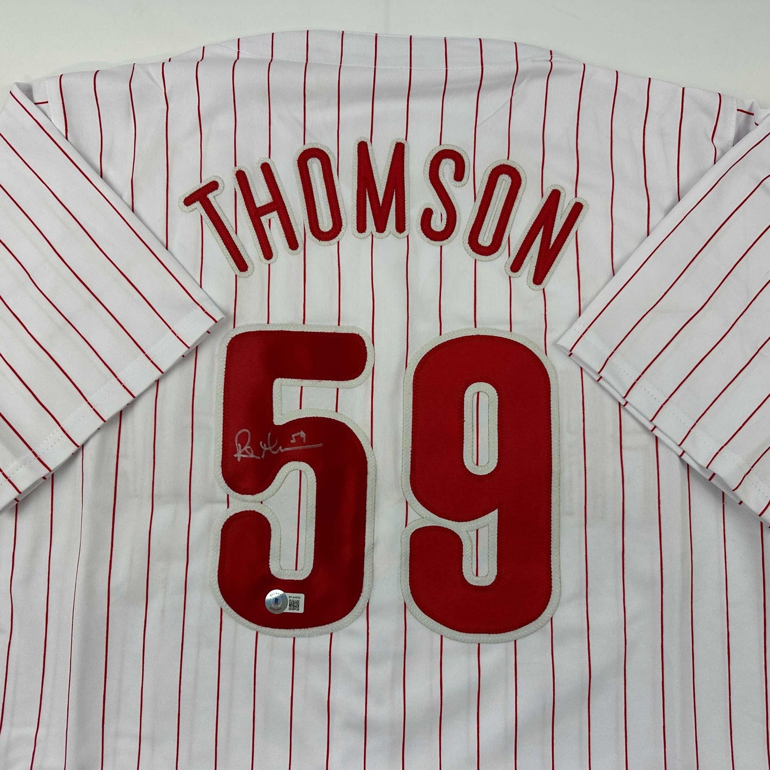 Camiseta de béisbol a rayas de Filadelfia autografiada/firmada por Rob Thomson Beckett BAS COA