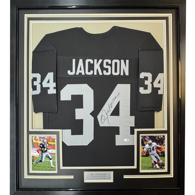 Camiseta de fútbol americano negra de Oakland, enmarcada, autografiada y firmada por Bo Jackson, 35 x 39, JSA COA