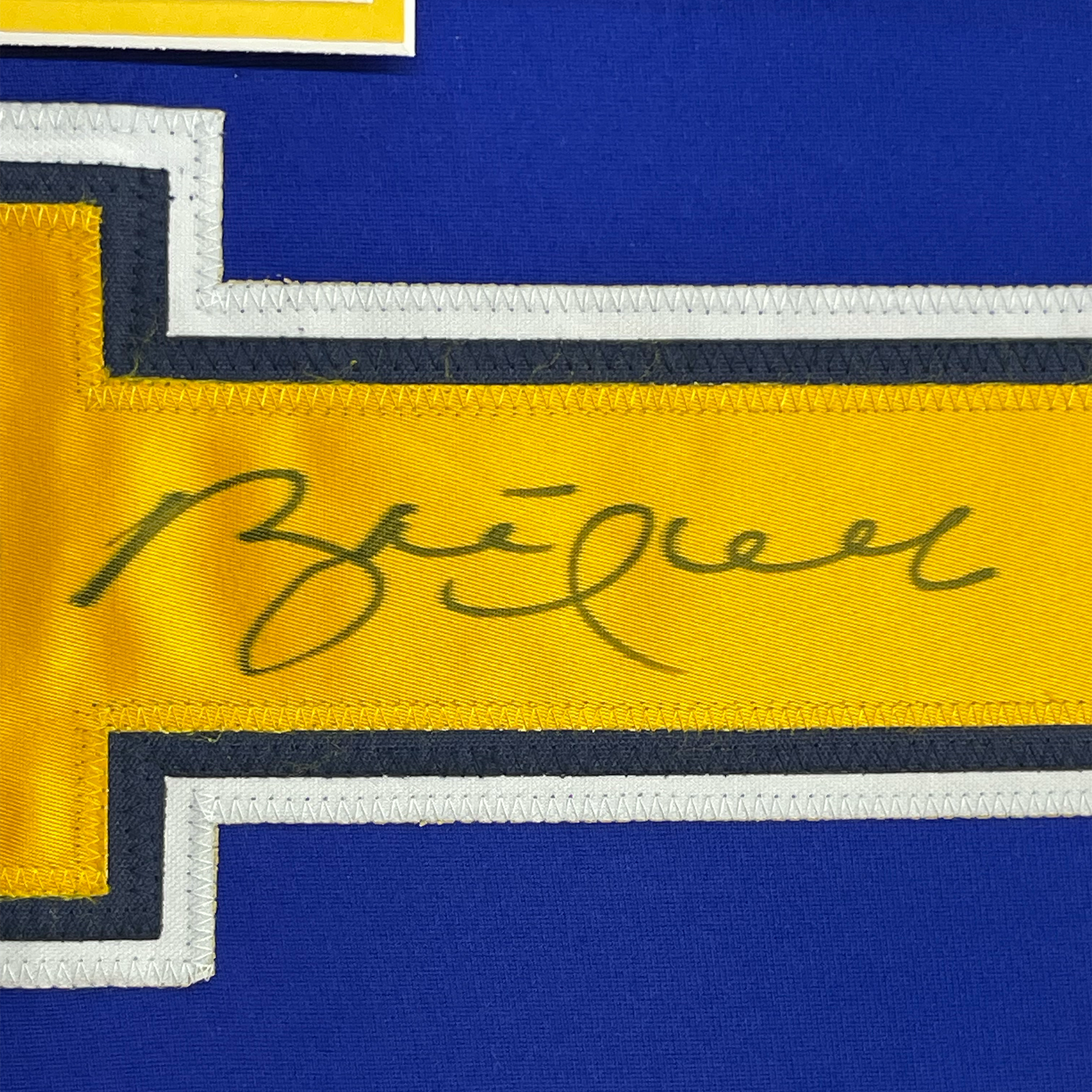 Camiseta de hockey azul y amarillo de St. Louis, enmarcada, autografiada y firmada por Brett Hull, 35 x 39, números JSA COA