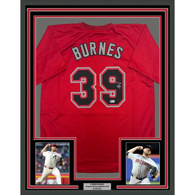 Camiseta de béisbol roja de Arizona de Corbin Burnes, enmarcada, autografiada y firmada, 35 x 39, Beckett BAS COA
