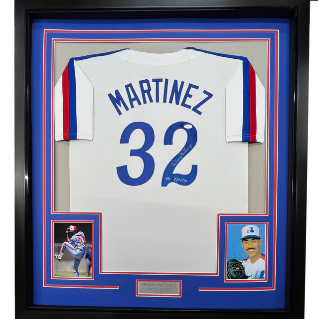 Camiseta de béisbol blanca de Montreal, enmarcada, autografiada y firmada por Dennis Martinez, 35 x 39, JSA COA