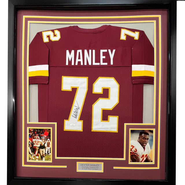 Camiseta de fútbol de Washington, color burdeos, enmarcada, autografiada y firmada por Dexter Manley, 35 x 39, JSA COA