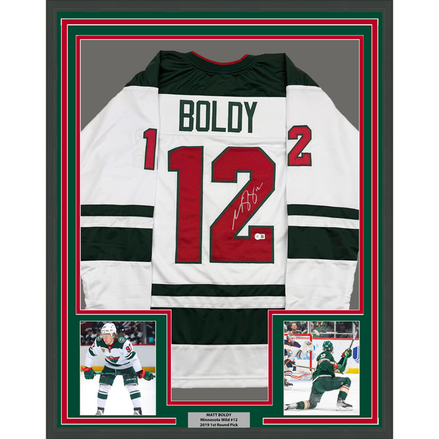 Camiseta de hockey blanca de Minnesota Beckett BAS COA enmarcada, autografiada y firmada por Matt Boldy, 35 x 39