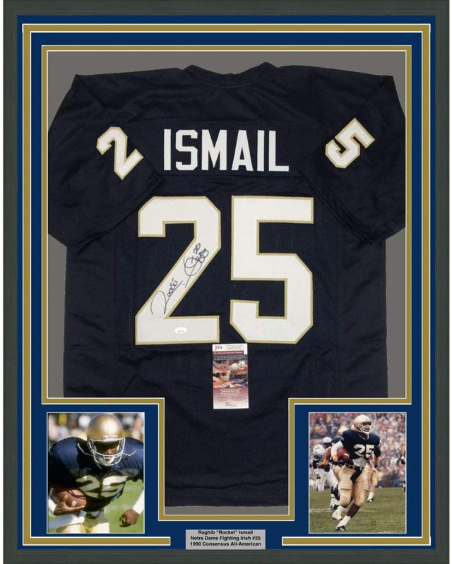 Camiseta de fútbol americano universitario azul de Notre Dame, enmarcada, autografiada y firmada por Raghib Ismail Rocket, 35 x 39, JSA COA
