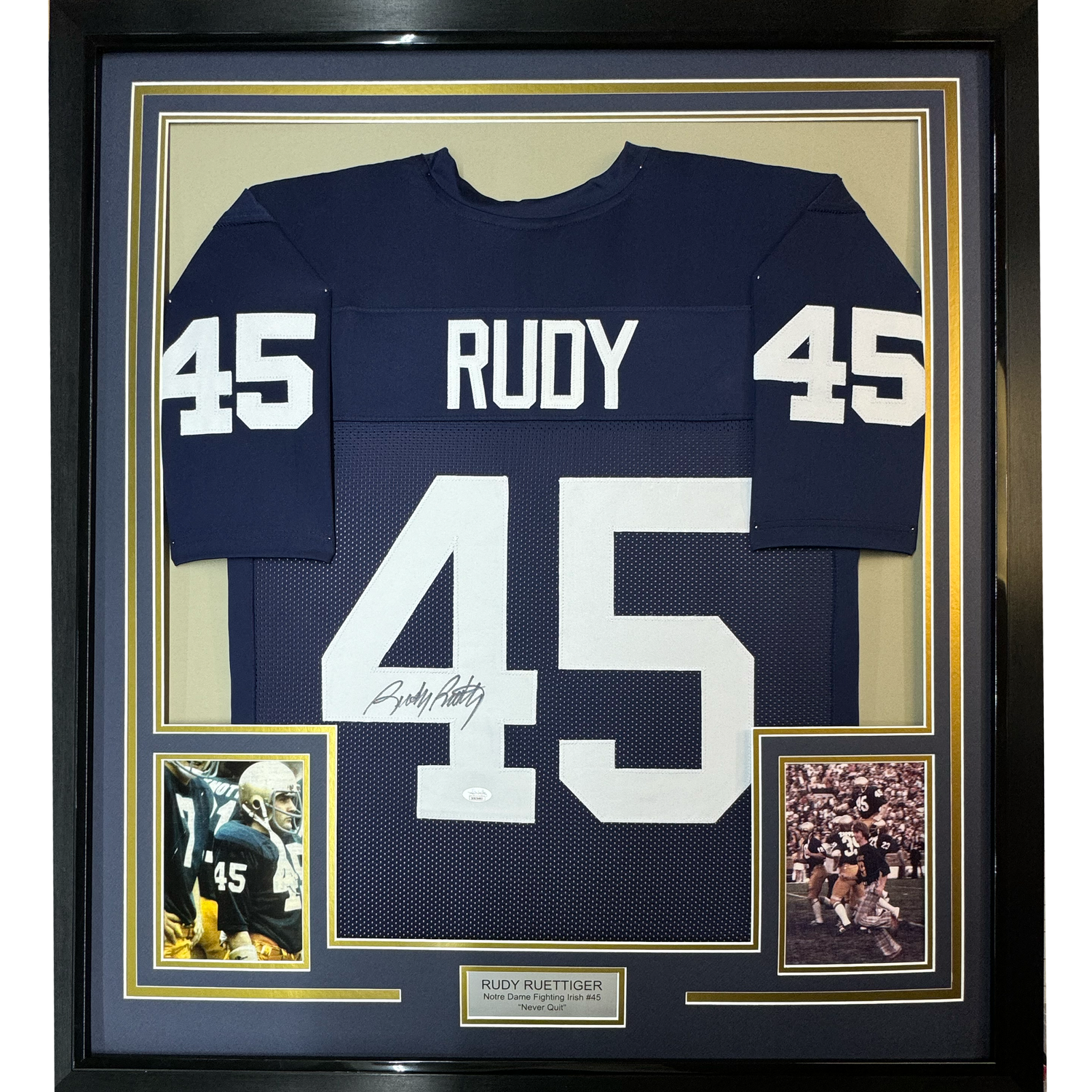 Camiseta de fútbol americano universitario de Rudy Ruettiger, enmarcada, autografiada y firmada, 35 x 39, azul de Notre Dame, JSA COA