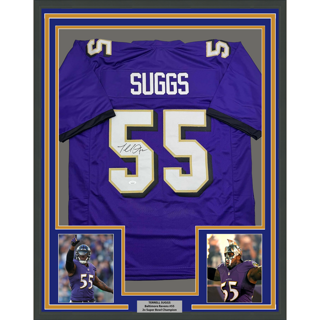 Framed Autographed/Signed Terrell Suggs 35x39 Baltimore Purple Football Jersey JSA COA #2