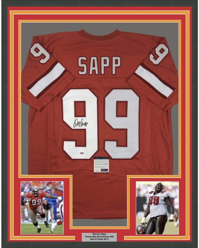 Camiseta de fútbol retro naranja de Tampa Bay, enmarcada, autografiada y firmada por Warren Sapp, 35 x 39, certificado de autenticidad (PSA/DNA)