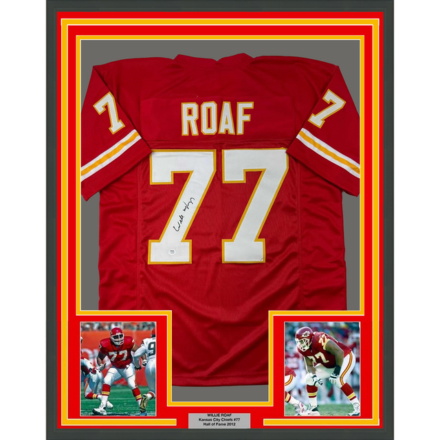 Camiseta de fútbol americano enmarcada, autografiada y firmada por Willie Roaf, 35 x 39, color rojo de Kansas City, Beckett BAS COA