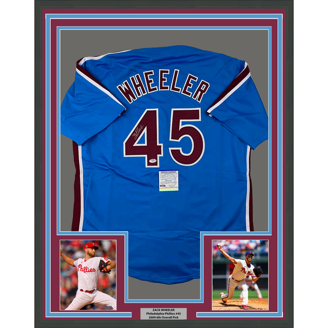 Camiseta de béisbol retro azul de Filadelfia de 35 x 39, enmarcada, autografiada y firmada por Zack Wheeler. Certificado de autenticidad de PSA y ADN.