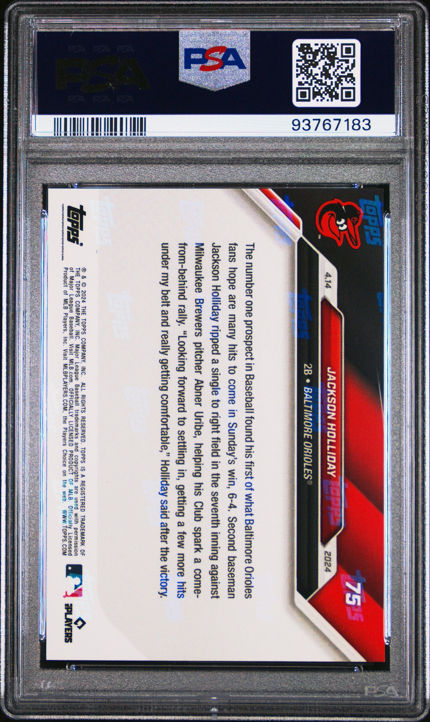 Tarjeta de béisbol de Jackson Holliday #75, primer hit de su carrera, calificada en 2024 (Topps Now), de la marca Rookie. PSA 10 Gem Mint.