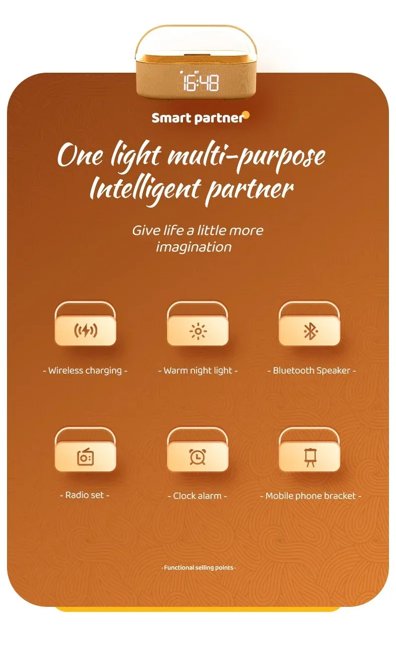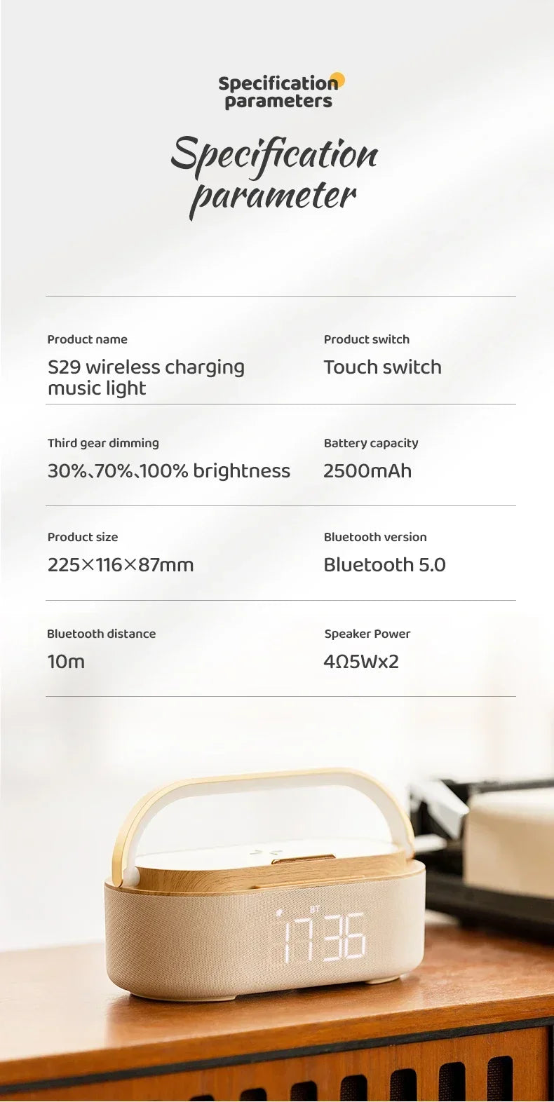 Altavoz Bluetooth, batería de 2500 mAh, compatible con carga inalámbrica de 15 W, reloj digital, pantalla, luz nocturna, despertador, estéreo Bluetooth.