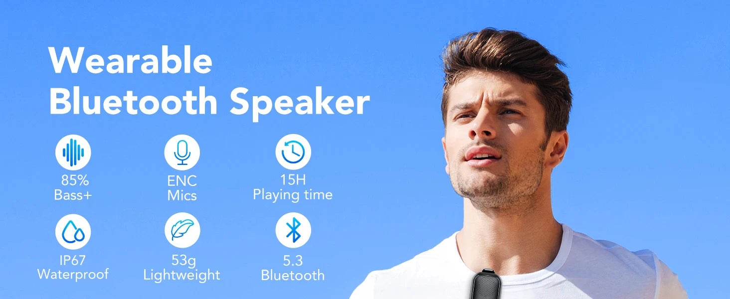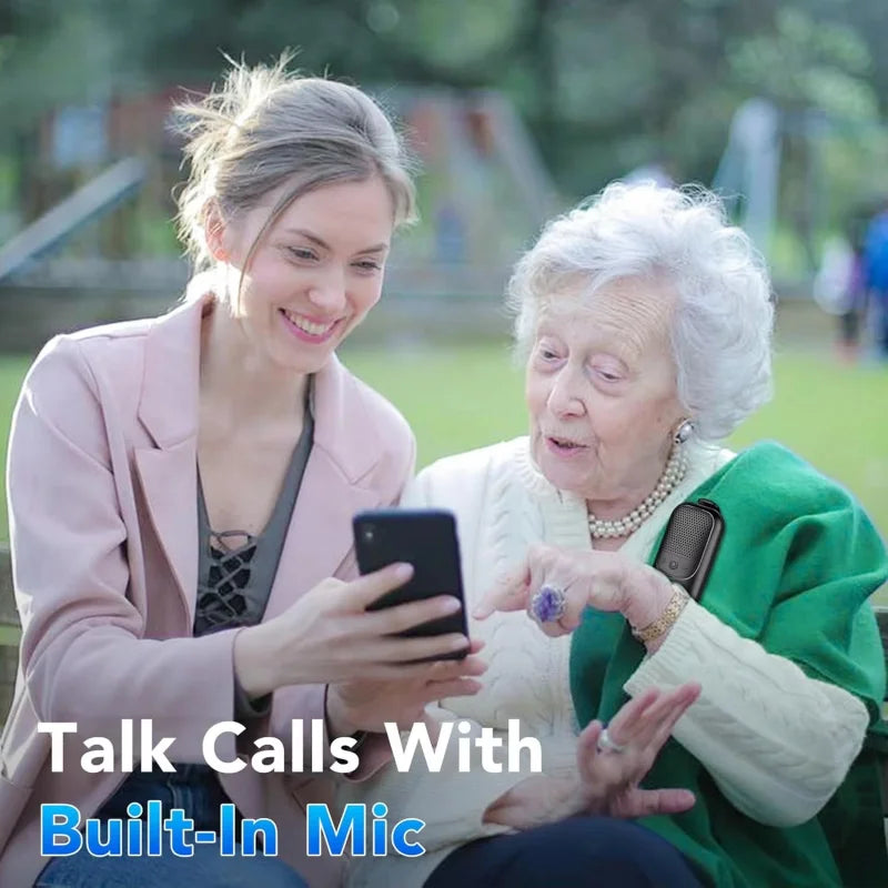 Altavoz Bluetooth inalámbrico portátil con clip y micrófono incorporado, ideal para deportes al aire libre.