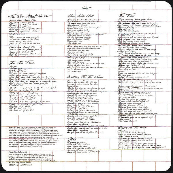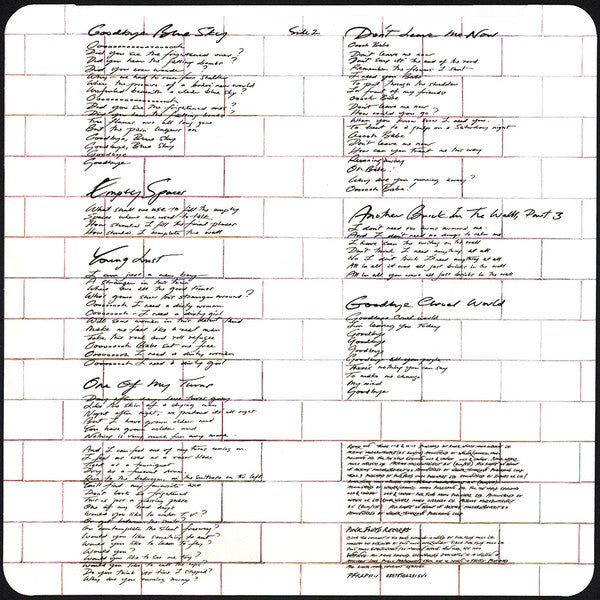 Lista de canciones: A1. ¿En carne y hueso?, A2. Hielo fino, A3. Otro ladrillo en la pared (Parte 1), A4. Los días más felices de nuestras vidas, A5. Otro ladrillo en la pared (Parte 2), A6. Madre, B1. Adiós cielo azul, B2. Espacios vacíos, B3. Lujuria juvenil, B4. Uno de mis turnos, B5. No me dejes ahora, B6. Otro ladrillo en la pared (Parte 3), B7. Adiós mundo cruel, C1. Hey You, C2. ¿Hay alguien ahí fuera?, C3. Nadie en casa, C4. Vera, C5. Trae a los chicos de vuelta a casa, C6. Cómodamente entumecido, D1. El espectáculo debe continuar, D2. En carne y hueso, D3. Corre como el demonio, D4. Esperando a los gusanos, D5. Detente, D6. El juicio, D7. Fuera del muro