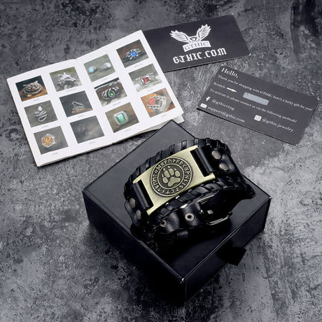 Nordic Wolf Paw Runes Leather Viking Bracelet