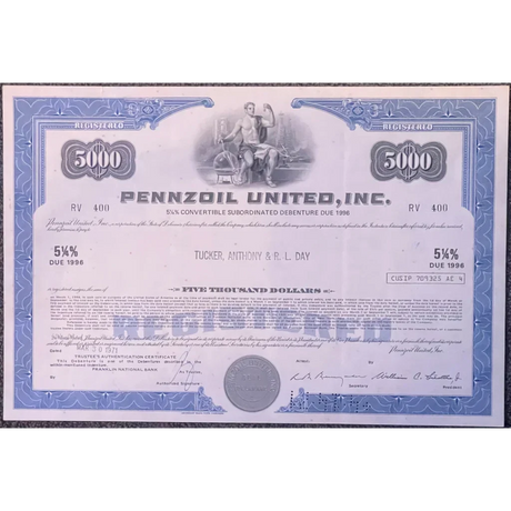 Rare 1970s Pennzoil Stock Certificate 5000 Shar...