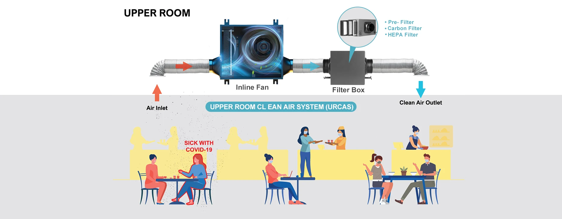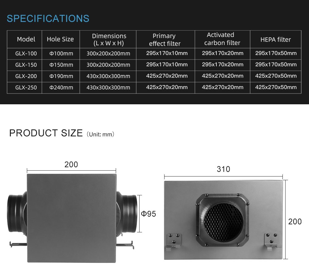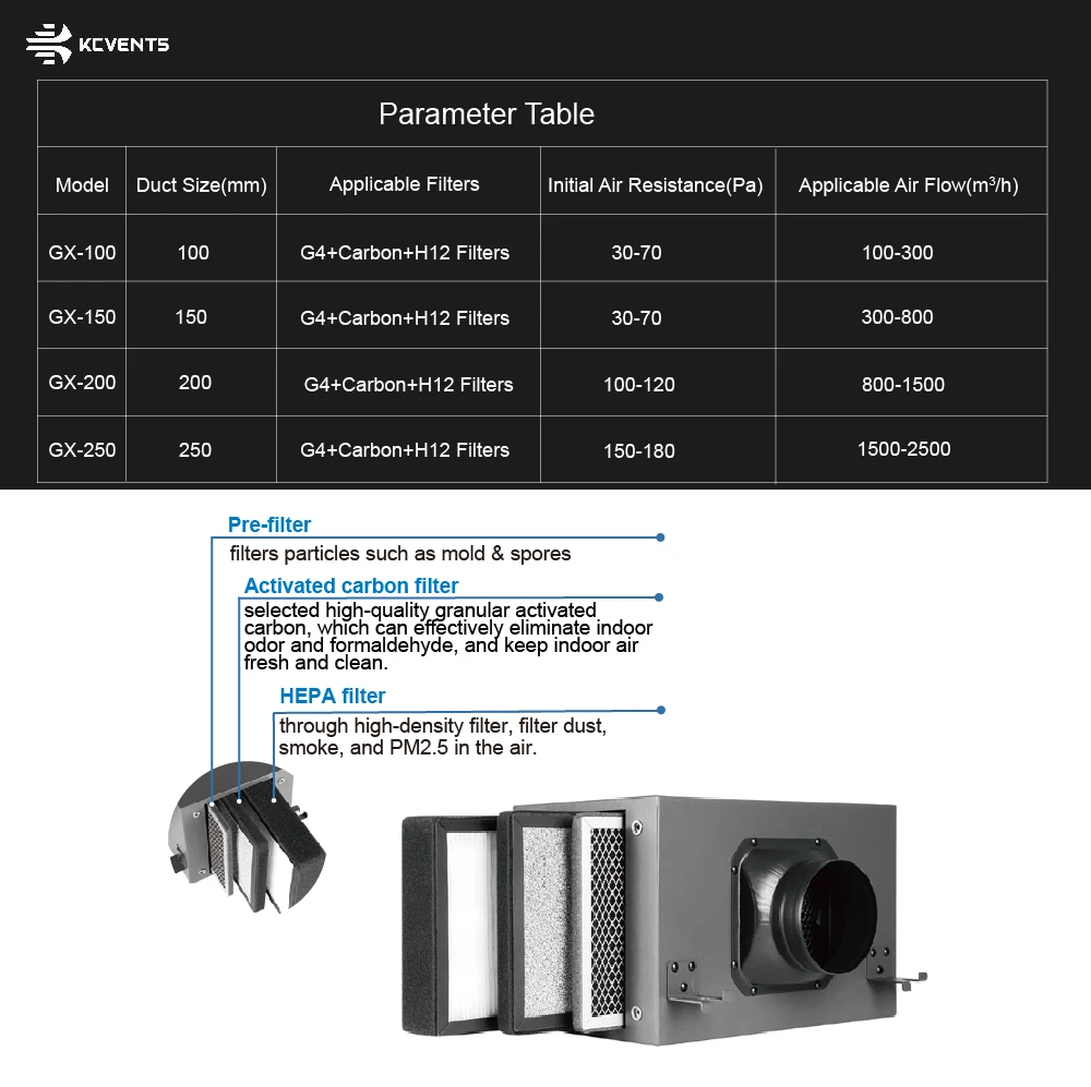 La caja de filtro debe aplicarse con un ventilador en línea, el flujo de aire generado por el ventilador pasará y será purificado por la caja de filtro, por lo que el aire de la salida de la caja de filtro estará limpio y fresco.