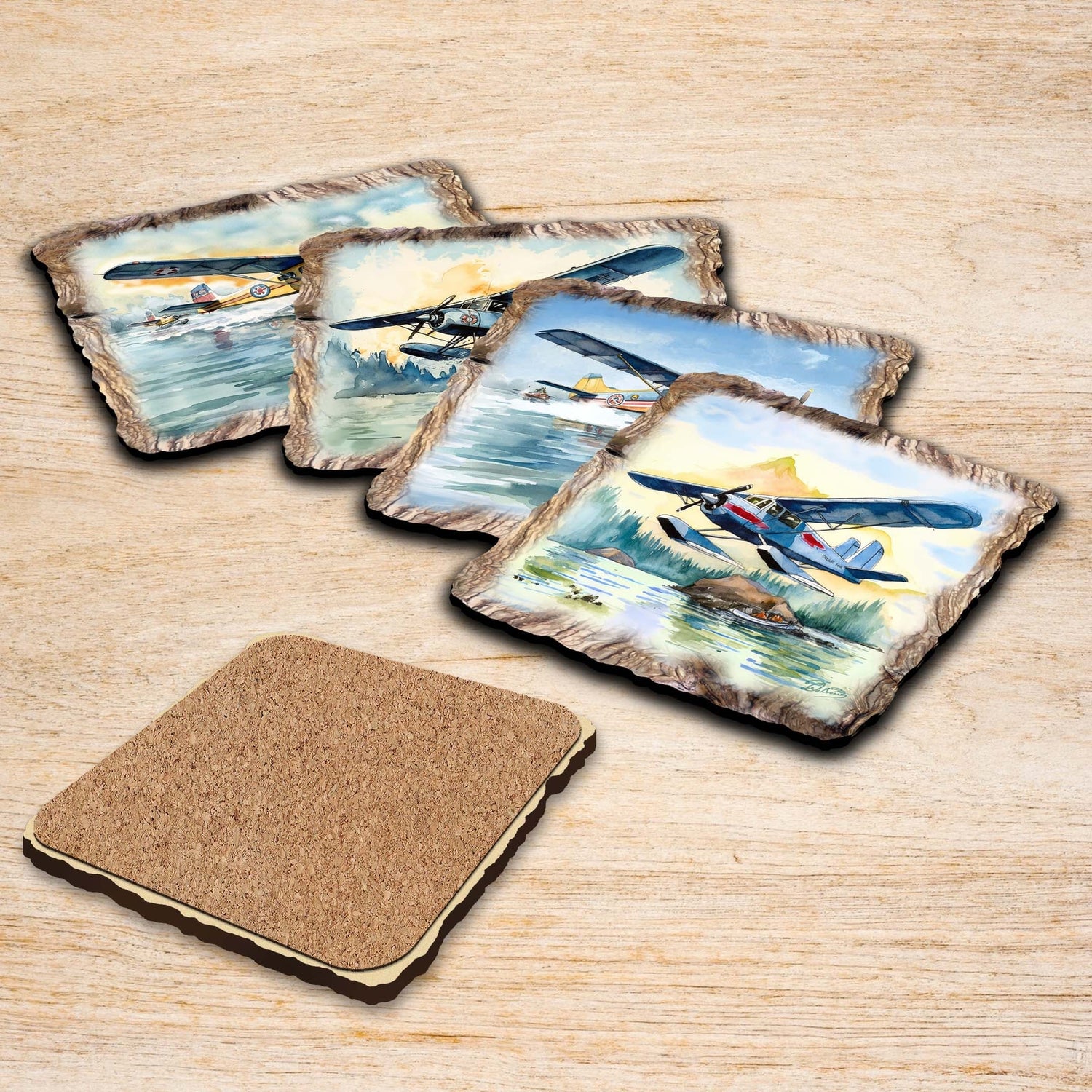 Juego de 4 posavasos de corcho de madera con diseño de aviones de Nature Wonders Nature Wildlife Decor - 95403C-S4