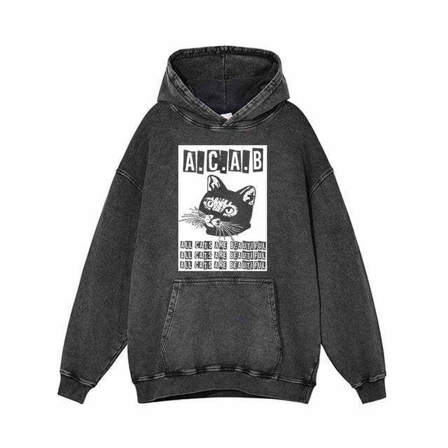 This vintage washed hoodie features a bold statement: All Cats Are Beautiful. Made from high-quality materials, it is soft and comfortable to wear. With a unique design and a classic fit, this hoodie is perfect for any cat lover. Show your love for felines with this ACAB hoodie.