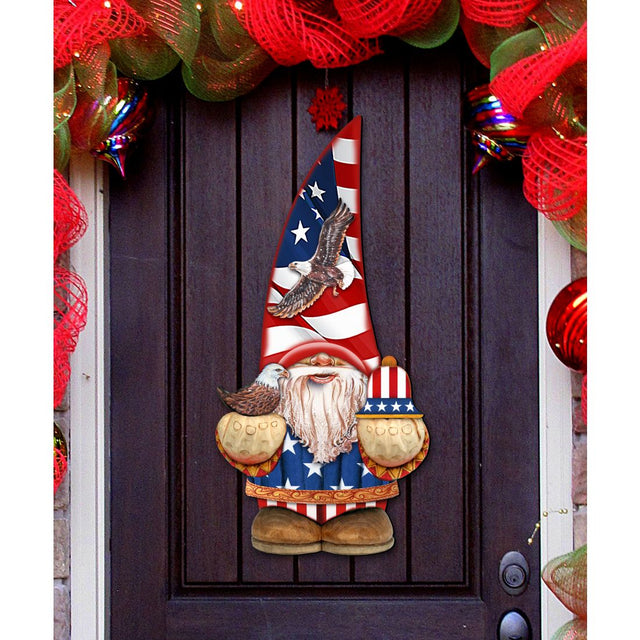 Decora tu puerta principal con un gnomo y la bandera patriota estadounidense de la tienda navideña oficial de G. Debrekht. Ofrecemos ideas decorativas para puertas navideñas para todas las estaciones y festividades. Hecho 100 % en EE. UU.