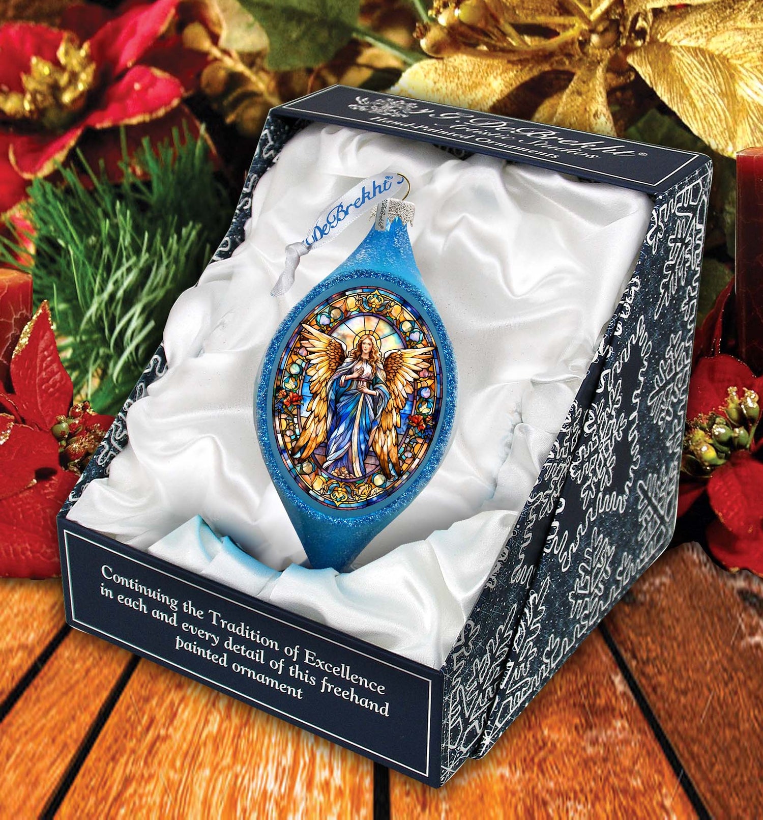 Acerca de la colección: Esta " Colección de adornos de vidrio Holiday Splendor" Se inspira en las familias de Europa del Este del Viejo Mundo, que durante casi 200 años pintaron hermosas cajas miniatura de papel maché lacado con incrustaciones de nácar. Se necesitaron años de perfeccionamiento de esta técnica para establecer esta nueva e innovadora forma de pintura que ahora presentamos con orgullo en nuestros exclusivos adornos de vidrio G. DeBrekht. Como antaño, están hechos de vidrio de mercurio soplado a mano de 1,5 mm, con polvo de plata en el interior y luego arenado en el exterior. La combinación de colores y técnicas de pintura multicapa crea un sólido efecto iridiscente. Nos enorgullece perfeccionar cada pieza añadiendo toques de oro, rematándolas con una hermosa cinta de raso y presentándolas en una lujosa caja forrada de raso. Hechas a mano en EE. UU., cada pieza es única y pasará a las futuras generaciones para que la atesoren.