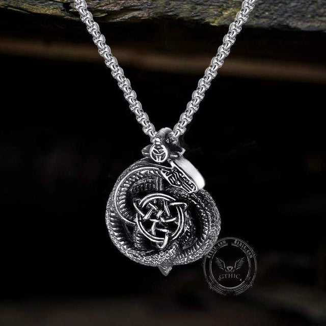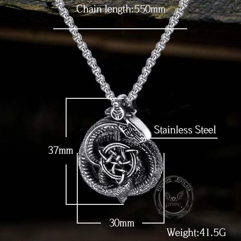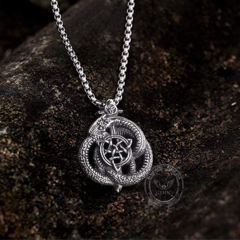 The Triquetra or the Trinity Knot is comprised of one continuous line interweaving around itself, meaning no beginning or end, or eternal spiritual life. People today wear the Triquetra for any of these reasons and to be reminded of the continuity and multi-faceted nature of higher truths. Dragons are as rich in symbolism as they were said to be rich in treasure. Most of all, dragons embody the destructive phase of the creation-destruction cycle. This means that they represent chaos and cataclysm, but also change and renewal. We made a pendant in the shape of a snake and Triquetra,get yours today!