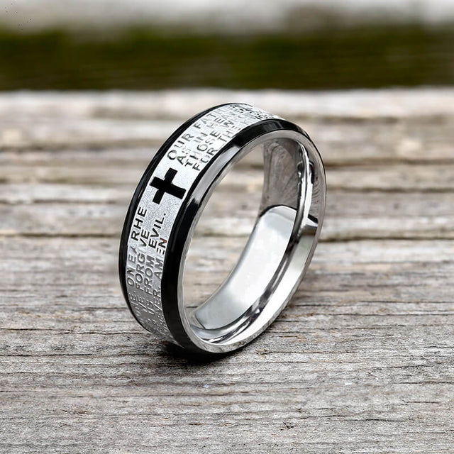 This Cross Prayer ring is perfect for expressing your faith. This ring is engraved with Christ's prayer words-Our Father, which is a central Christian prayer, a longer form within the Sermon on the Mount in the Gospel of Matthew, and a shorter form in the Gospel of Luke. Crafted from stainless steel, this meaningful ring is an elegant way to show your appreciation for God.