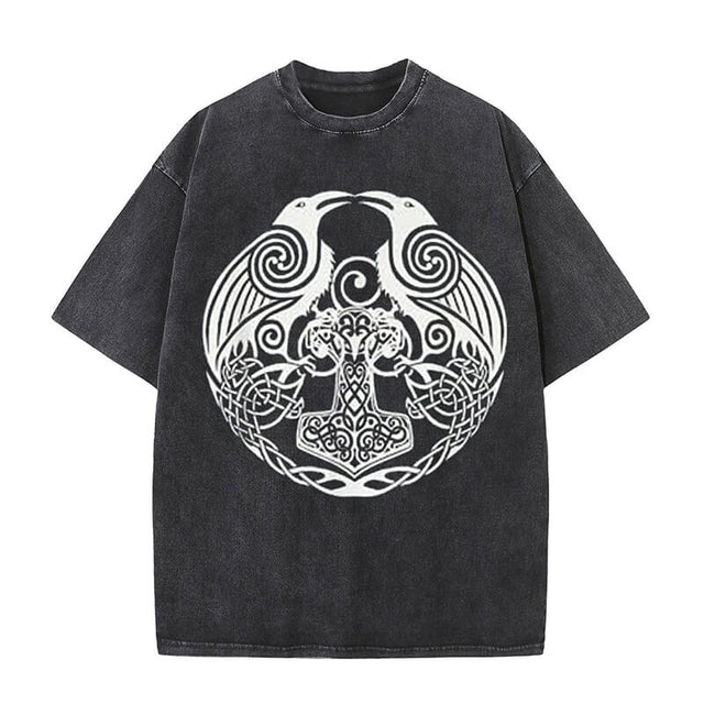 This Double Ravens Celtic Knot Washed T-shirt features the iconic Viking symbols of Huginn and Muninn, representing Odin's raven companions. Made from high-quality materials, this shirt is not only stylish but also pays homage to Norse mythology. Perfect for any fan of Viking culture or mythology.