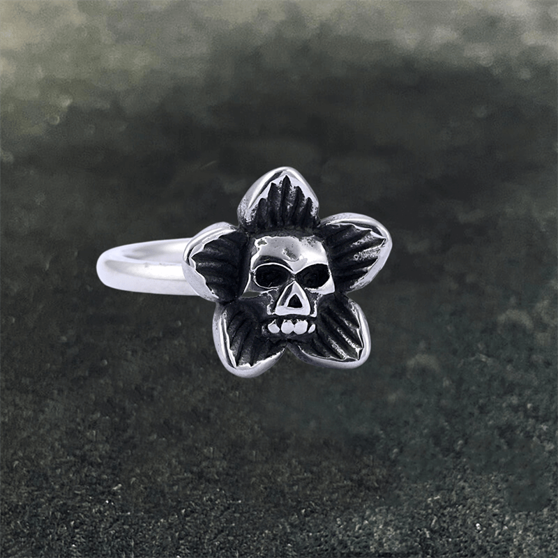 Featuring a delicate skull, this stainless steel ring is adorned with intricately carved flowers, symbolizing the harmony between life and death, strength and fragility. The contrast between the delicate blooms and the skull's striking features creates mesmerizing visual appeal that effortlessly grabs attention.