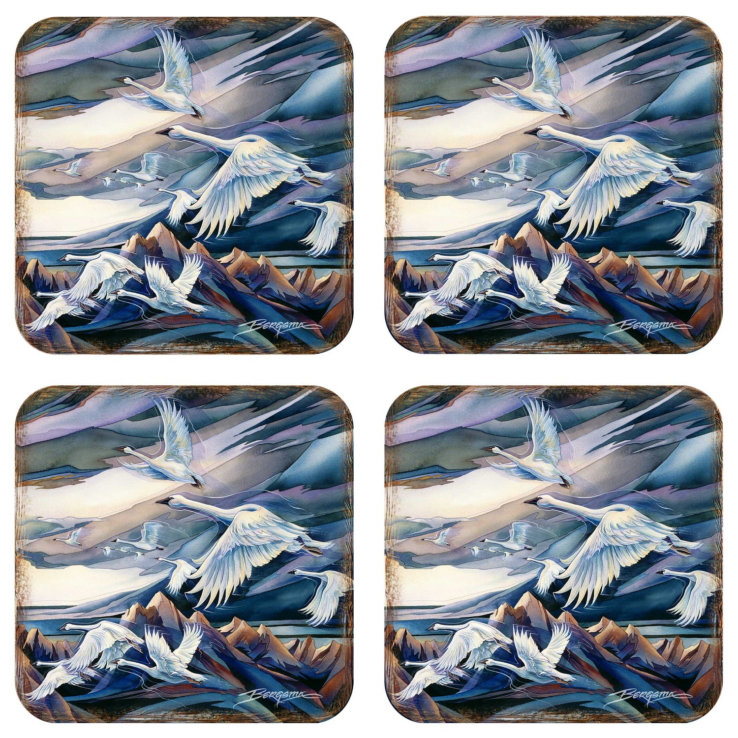 Juego de 4 posavasos de corcho de madera con diseño de cisnes voladores de J. Bergsma - Decoración costera - 8199457C-S4