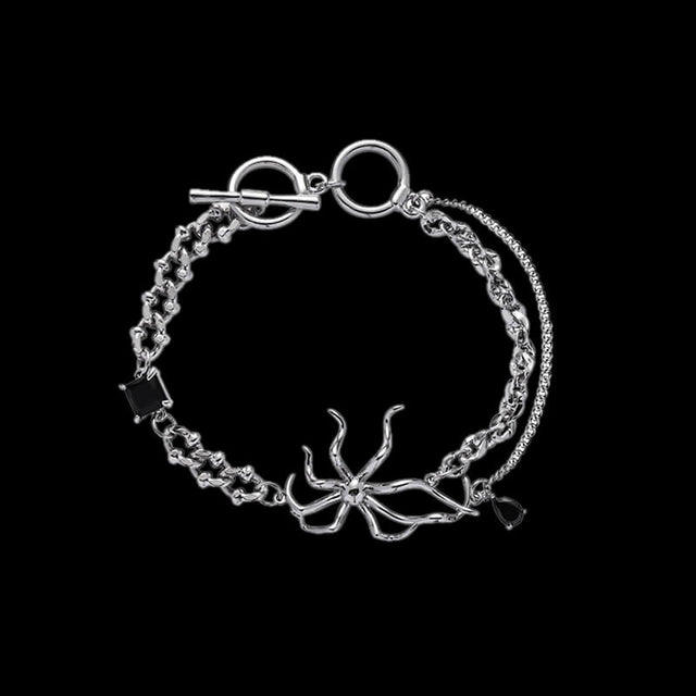 This gothic spider bracelet is the perfect addition to any alternative jewelry collection. Made from high-quality alloy, it features a detailed spider design with eight legs and intricate chain. Wear it as a statement piece on its own or stack it with other gothic bracelets for a bold and edgy look. Whether you're dressing up for a night out or adding a touch of gothic style to your everyday wardrobe, this spider bracelet is a must-have accessory.