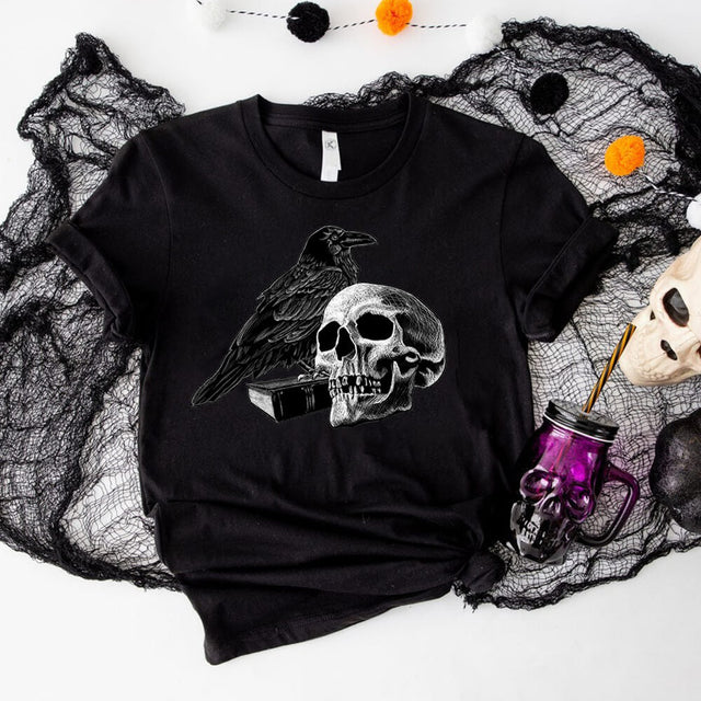 Gothic Raven Skull Round Neck Short Sleeve T-shirt