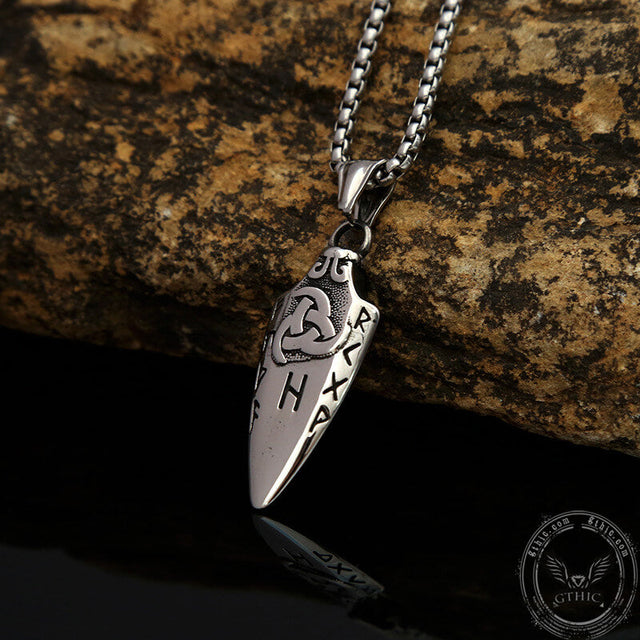 Crafted from durable stainless steel, this Viking pendant features the iconic Horns of Odin and a triangular spear with intricate runes carved into it. Perfect for any fan of Norse mythology, this pendant is a unique piece that adds a touch of authenticity to any outfit.