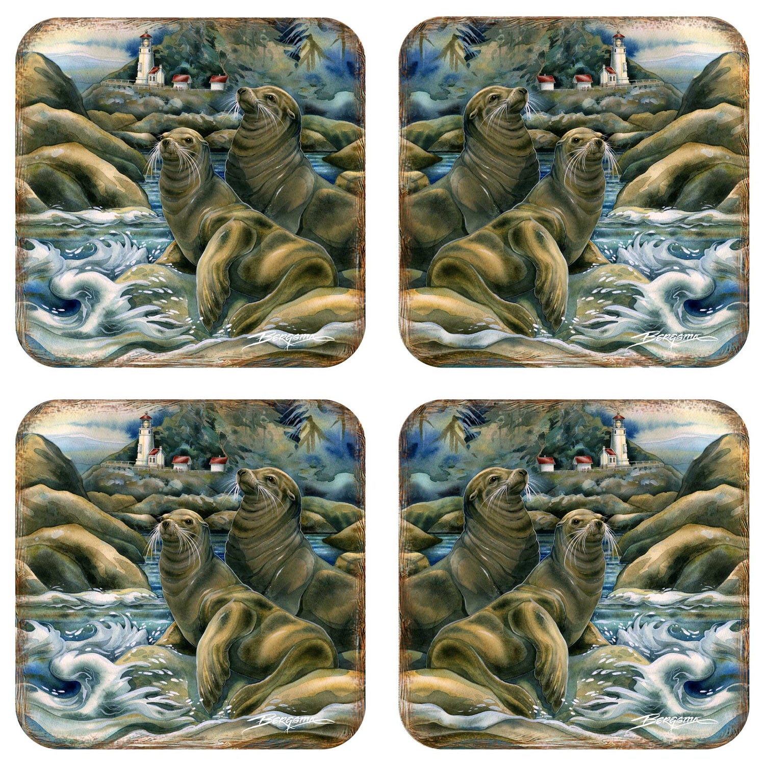 Juego de 4 posavasos de corcho de madera "Leones del Mar" de J. Bergsma - Decoración de fauna costera - 8199466C-S4