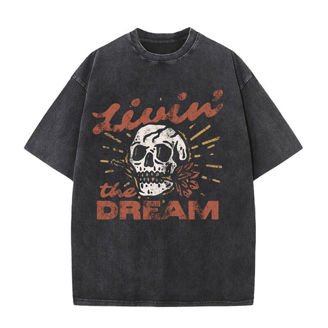 The standout feature of this t-shirt is its eye-catching "Living the Dream" skull design. The vintage washed effect adds a touch of nostalgia and gives it a worn-in look that's effortlessly cool. The skull graphic represents a rebellious spirit and serves as a reminder to live life to the fullest.