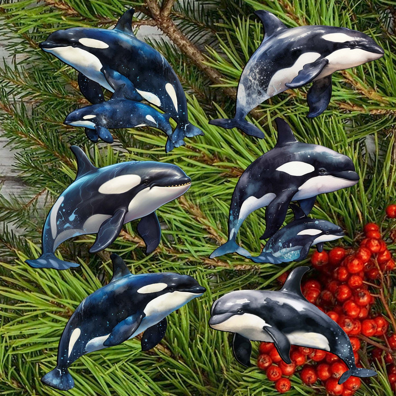 Juego de 6 adornos decorativos de madera con forma de orcas majestuosas, de G. Debrekht - Decoración de vida silvestre - 8090102C-S6