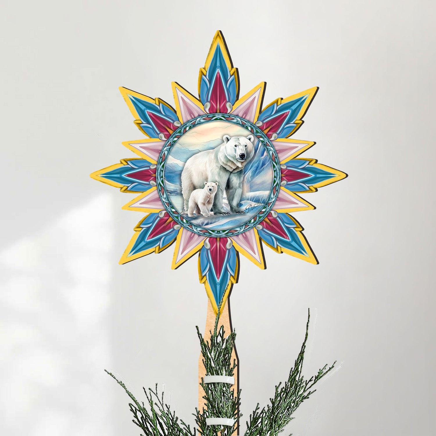 Decoración de madera para la punta del árbol de Navidad con forma de oso polar y cachorro, de G. Debrekht - Decoración navideña con animales salvajes - 89509