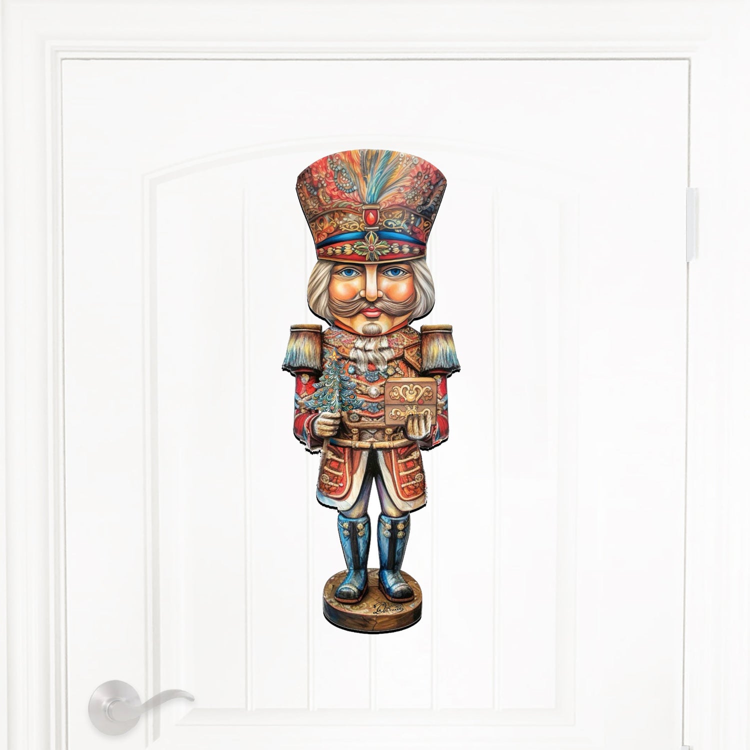 Celebra las fiestas con la decoración navideña para puerta del Príncipe Cascanueces. Creada por el reconocido G. Debrekht, esta decoración de madera presenta detalles coloridos y detalles intrincados. Dale un toque navideño a tu hogar y deslumbra a tus invitados.