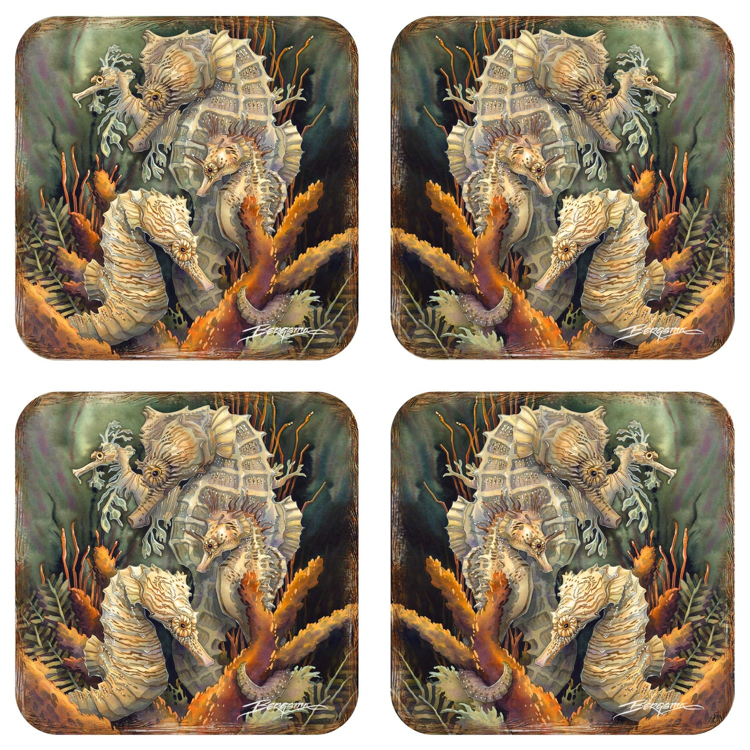 Juego de 4 posavasos de corcho de madera con diseño de caballitos de mar de J. Bergsma - Decoración costera - 8199454C-S4