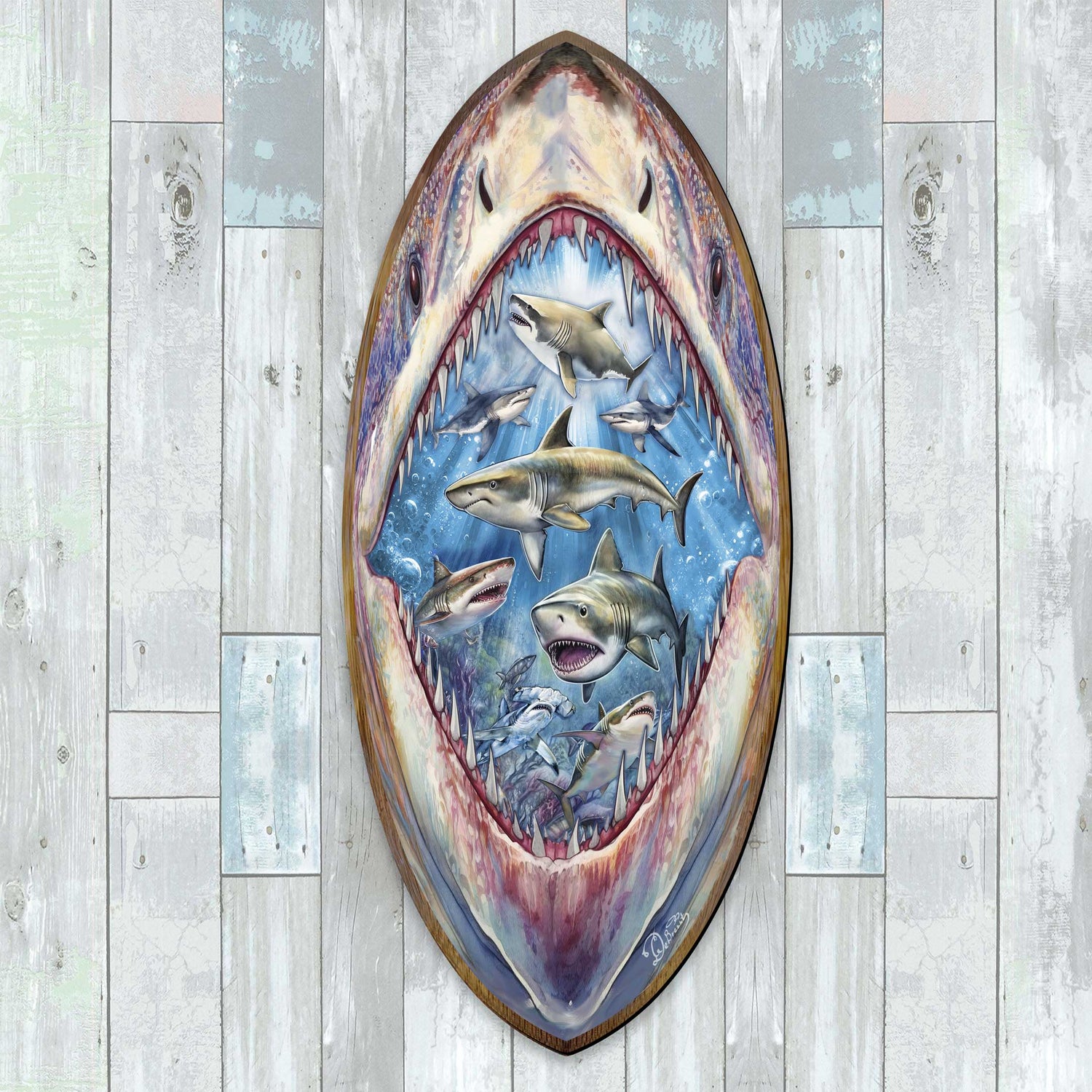 Tabla de surf costera con diseño de tiburón, arte mural artesanal, decoración oceánica de G. DeBrekht - Decoración costera navideña - 8490138HS - Pequeño - 24 x 10,5 x 1 está agotado y se enviará tan pronto como vuelva a estar disponible.