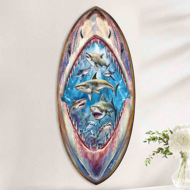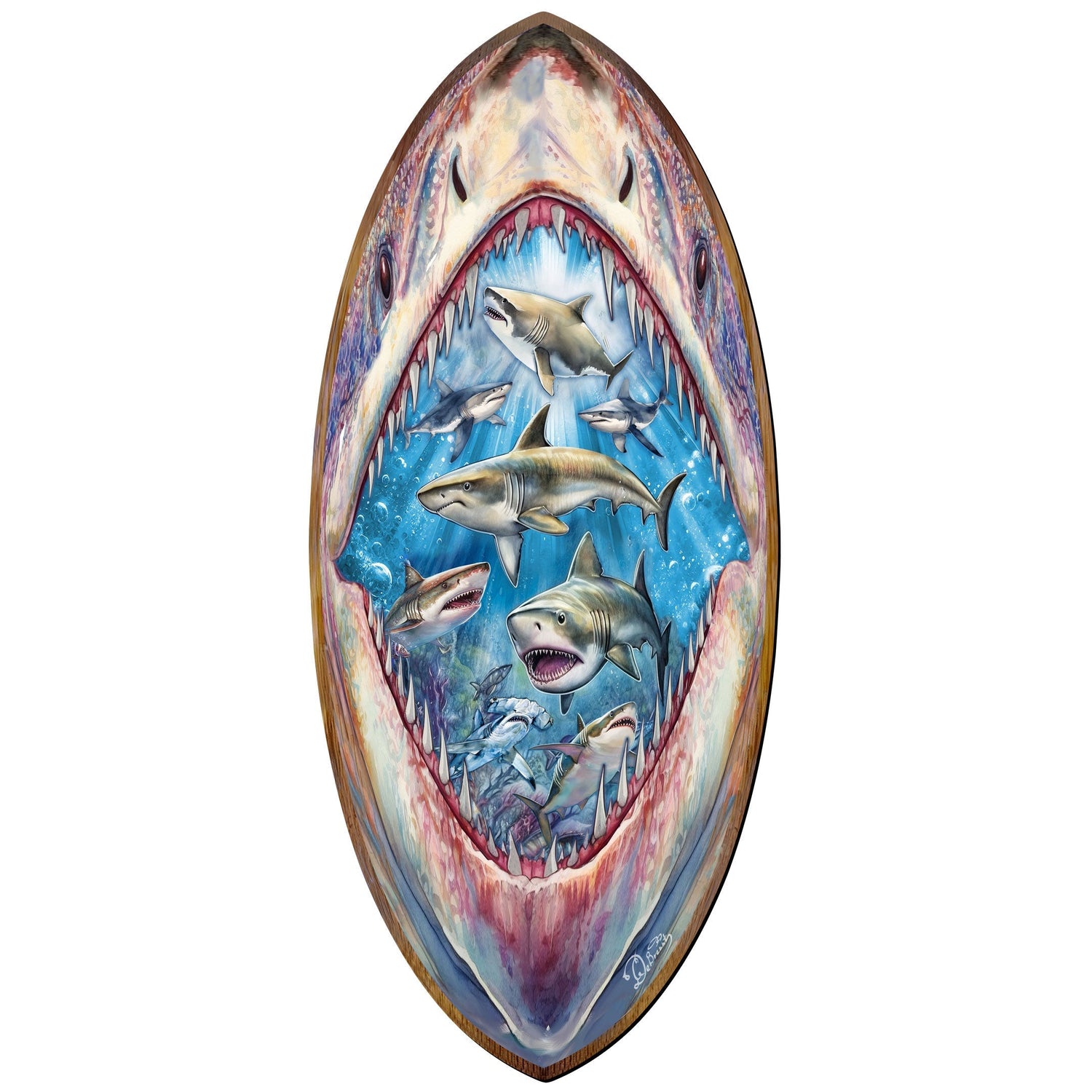 Tabla de surf costera con diseño de tiburón, arte mural artesanal, decoración oceánica de G. DeBrekht - Decoración costera navideña - 8490138HS