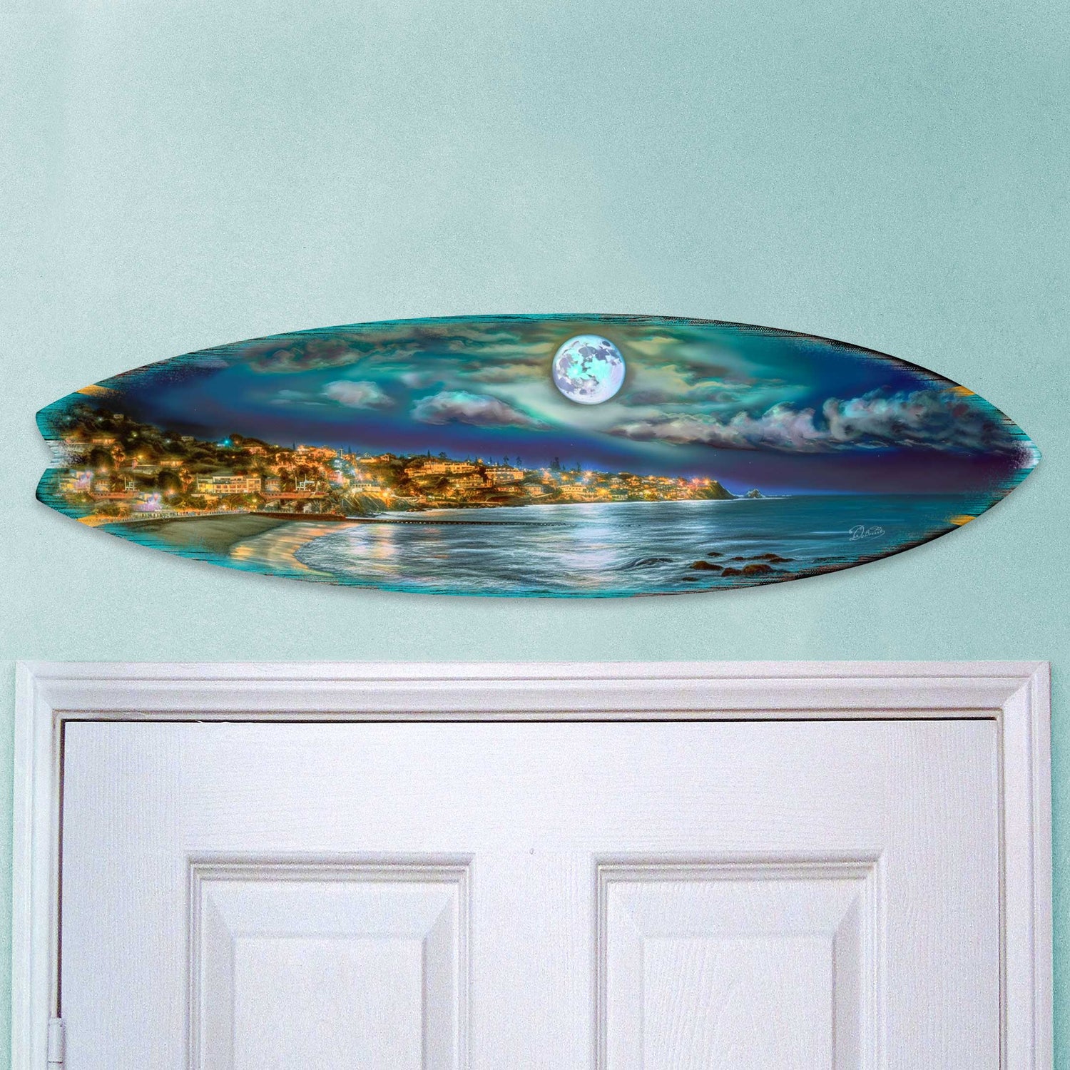 Arte mural costero con tabla de surf - Arte mural de noche de luna llena de G. DeBrekht - Decoración navideña costera - 8490137HS