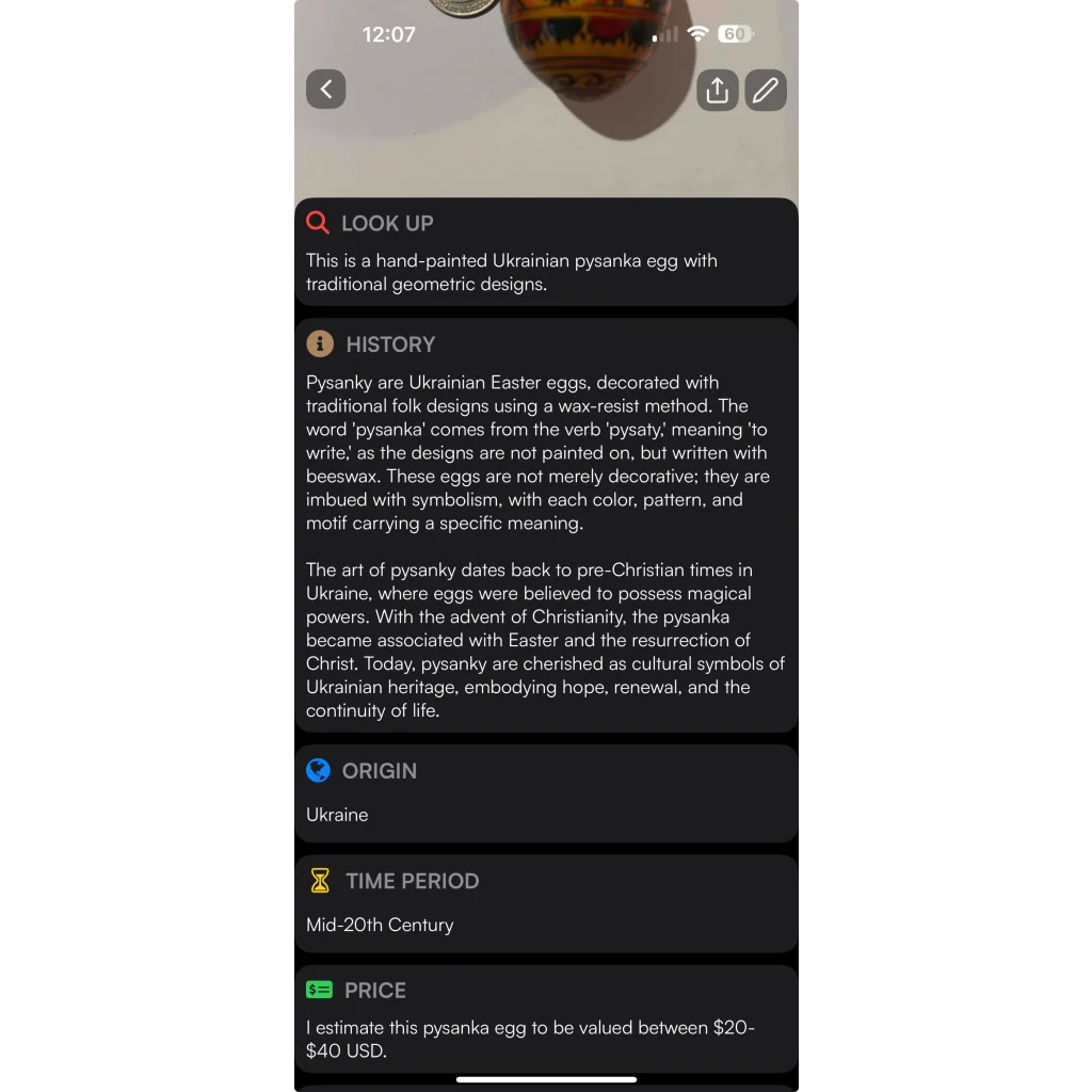 Hold onto your hats, folks! This Ukrainian pysanka egg is a true gem that's bound to knock your socks off! The AI Scan has spoken, and boy, does it have some exciting things to say about this one-of-a-kind masterpiece. I'm absolutely floored that this stunning piece isn't valued higher - it's a real head-scratcher!