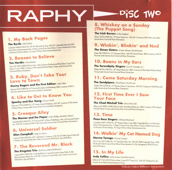 Tracklist: 1-1. A Worried Man, 1-2. Georgy Girl, 1-3. You've Got To Hide Your Love Away, 1-4. Turn Down Day, 1-5. Do You Believe In Magic, 1-6. Saturday Night, 1-7. Mama Don't Allow, 1-8. Pretoria, 1-9. The Motorcycle Song, 1-10. King Of The Road, 1-11. Abilene, 1-12. Funny Way Of Laughing, 1-13. Dominique, 1-14. Society's Child (Baby I've Been Thinking), 1-15. Eve Of Destruction, 2-1. My Back Pages, 2-2. Reason To Believe, 2-3. Ruby, Don't Take Your Love To Town, 2-4. Like To Get To Know You, 2-5. Creeque Alley, 2-6. Universal Soldier, 2-7. The Reverend Mr. Black, 2-8. Whiskey On A Sunday (The Puppet Song), 2-9. Winkin', Blinkin' And Nod, 2-10. Beans In My Ears, 2-11. Come Saturday Morning, 2-12. First Time Ever I Saw Your Face, 2-13. Time, 2-14. Walkin' My Cat Named Dog, 2-15. In My Life