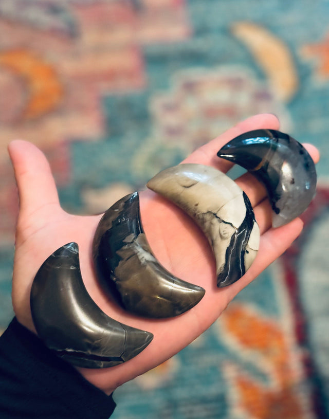 These hand-carved crescent moons are sculpted from Volcano Agate—a mesmerizing variety of chalcedony formed by ancient volcanic activity. In natural light, they display swirling bands of smoky grays, charcoals, and soft creams, evoking the raw beauty of cooled lava flows.