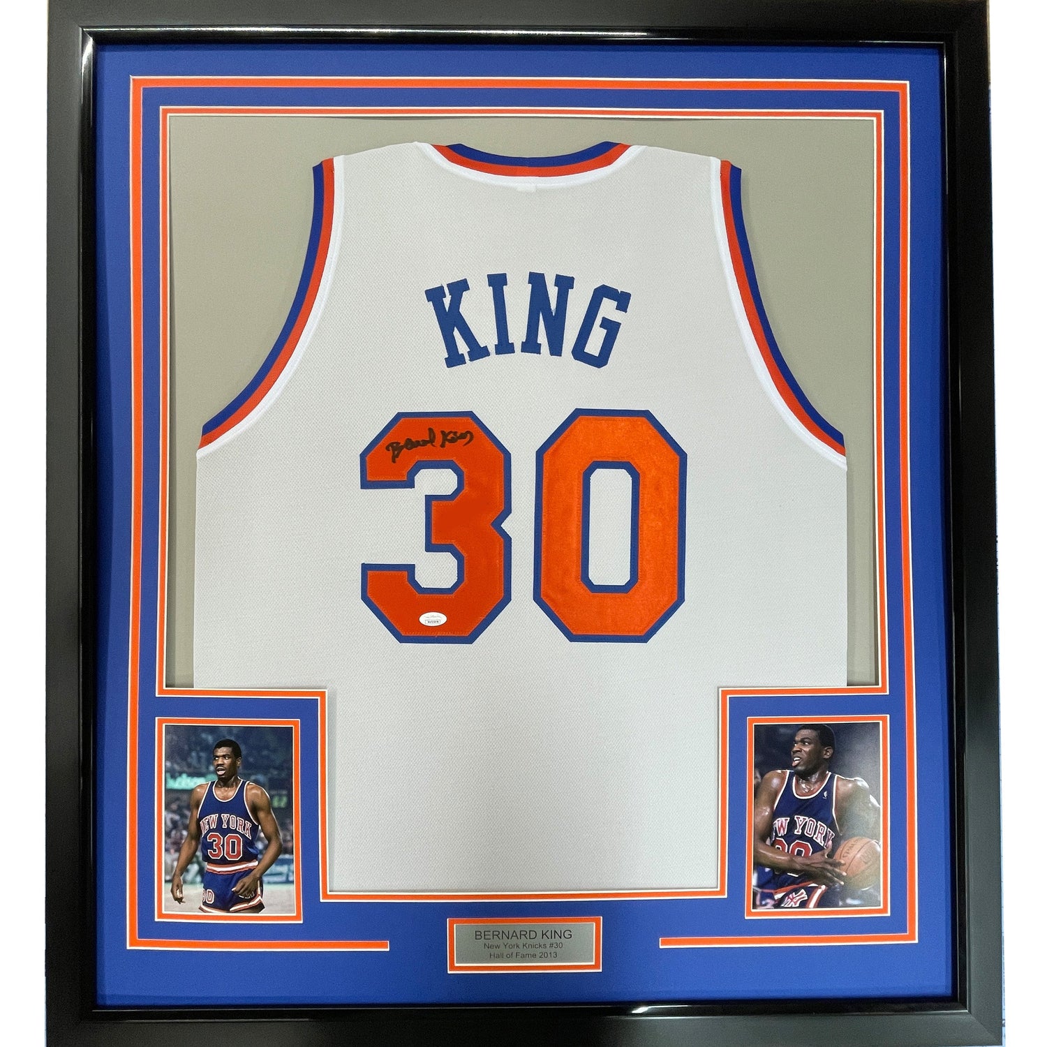 Framed Autographed/Signed Bernard King 35x39 New York White Basketball Jersey Beckett BAS COA