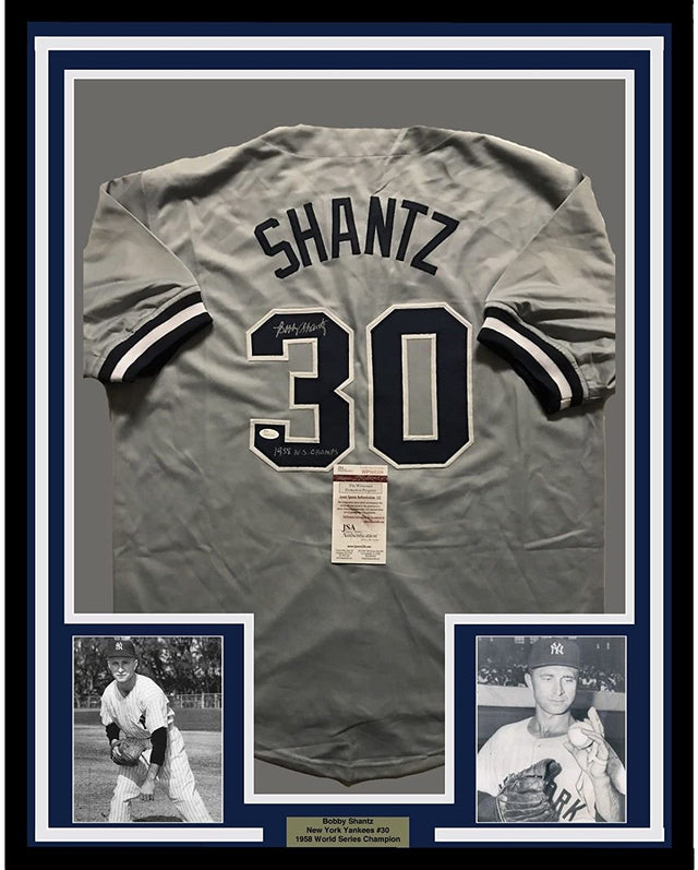 Framed Autographed/Signed Bobby Shantz 35x39 New York Grey Baseball Jersey JSA COA
