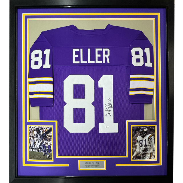 Framed Autographed/Signed Carl Eller HOF 04 35x39 Minnesota Vikings Purple Football Jersey JSA COA