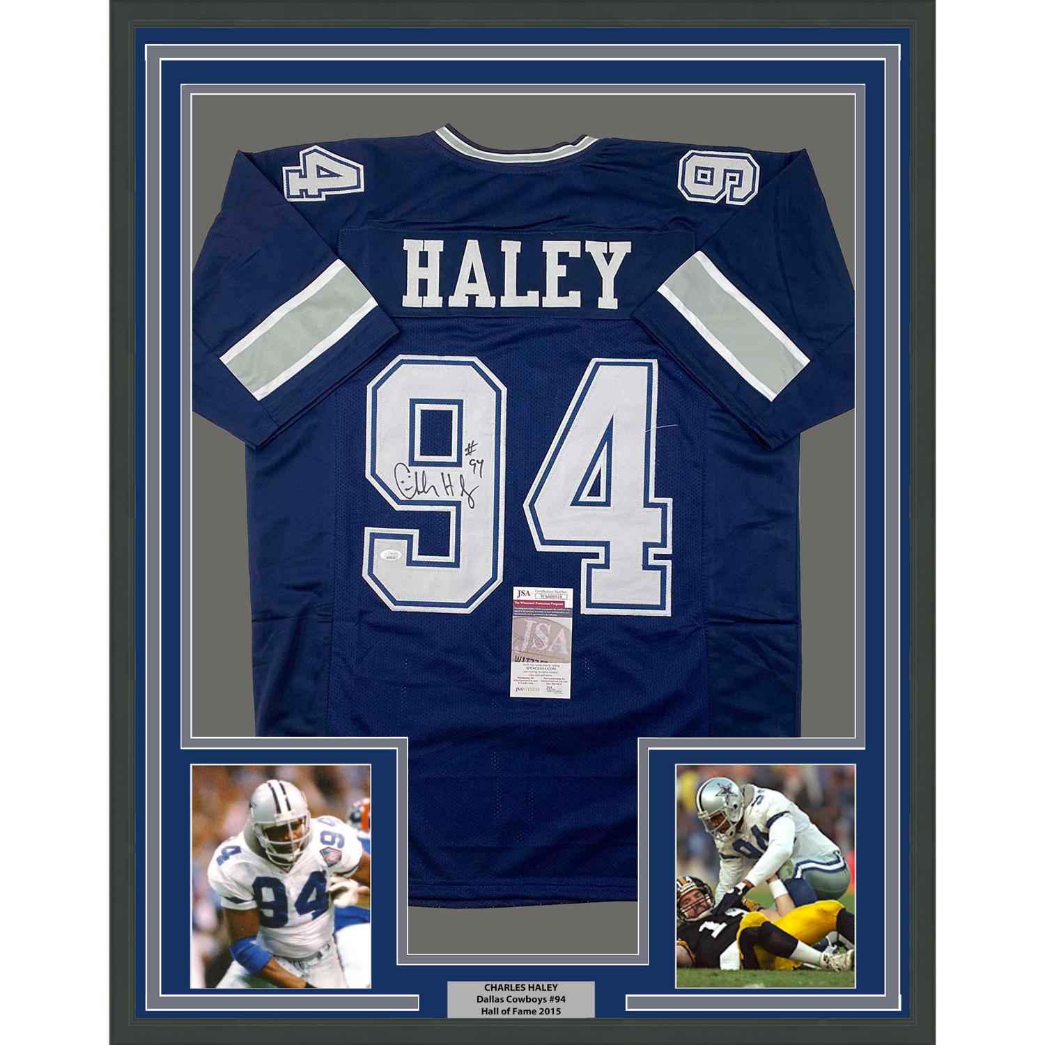 Framed Autographed/Signed Charles Haley 35x39 Dallas Blue Football Jersey JSA COA